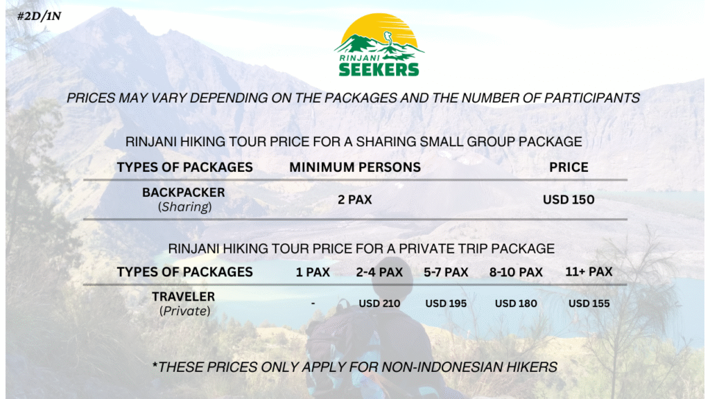 This 2 Day 1 Night program is intended for beginners and those who have a limited schedule and unable to take the summit programs. However, camping out at Senaru crater rim is unbelievably worth it. At 2,641 masl, you will be able to witness the majestic of Mount Rinjani towering the highest among the mountain ridges. The Son of Rinjani as known as Gunung Baru Jari, which stands gracefully amidst the sea-like lake (Danau Segara Anak) spices up the beauty of the whole view.